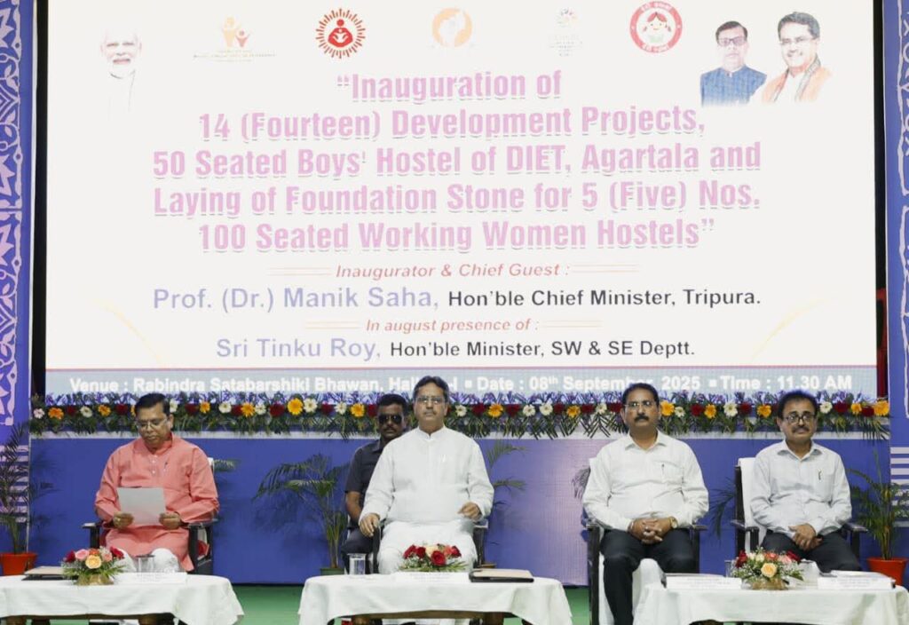 Agartala, Tripura, 8th of September, 2025 : With the initiative of Social Welfare and Social Education organized the Inauguration of 14 Development Projects and Laying Foundation Stone for Five- 100 Seated Working Women Hostels and 50 seated boys Hostels of DIET(Virtually) ceremony at Rabindra Satabarshiki Bhawan, Agartala, Tripura on Monday (8th September, 2025). In the presence of many distinguished dignitaries Hon’ble Chief Minister Dr. Manik Saha inaugurated the programme by lighting the lamp.