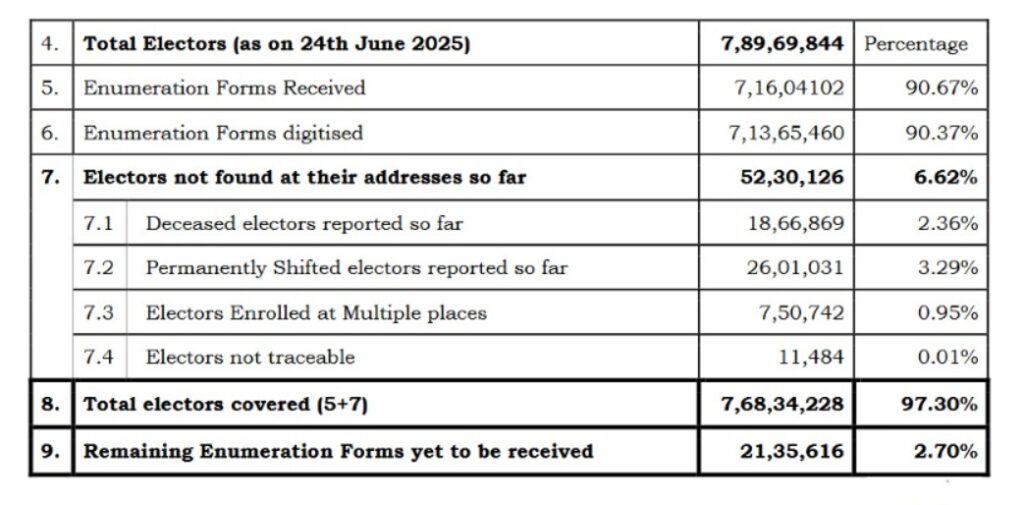 New Delhi, Delhi, 22nd of July 2025 : In the ongoing SIR in Bihar, efforts have been intensified to ensure that all eligible electors are included in the draft electoral roll to be published on August 1, 2025. The entire election machinery, including nearly 1 lakh BLOs, 4 lakh volunteers and 1.5 lakh BLAs appointed by the District Presidents of all the 12 major political parties in Bihar are working together to search those electors who are yet to submit their Enumeration Forms (EFs) or have not been found at their addresses.