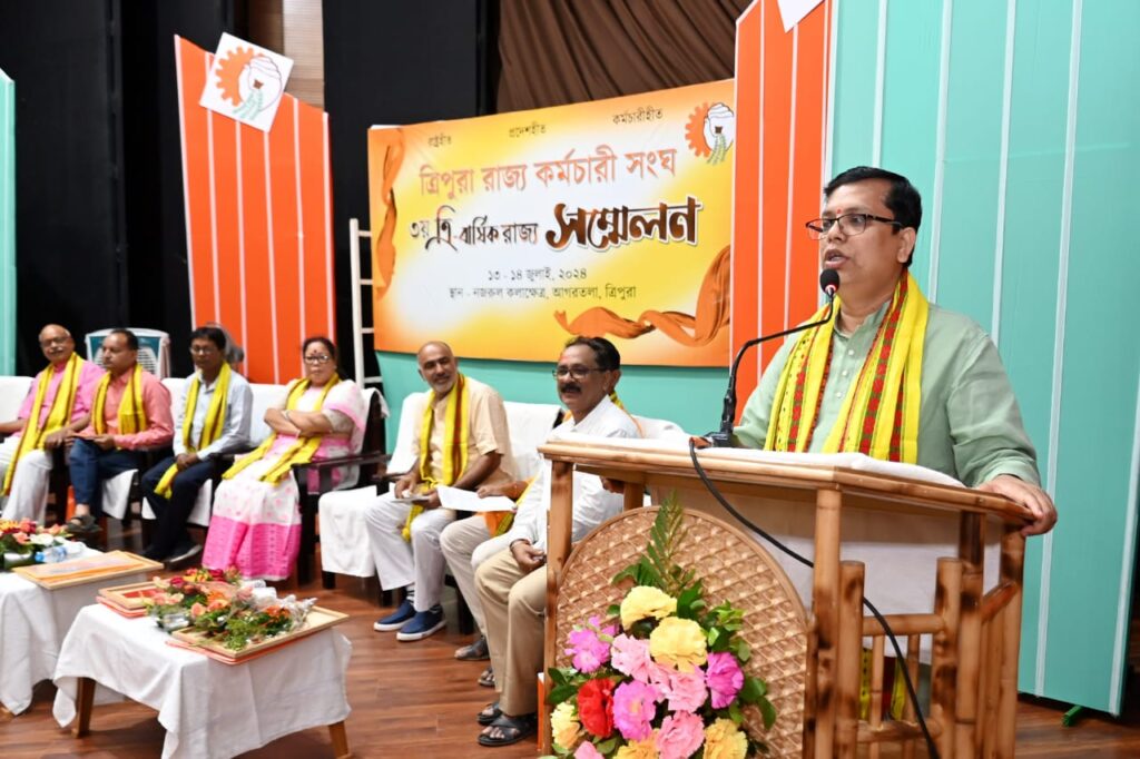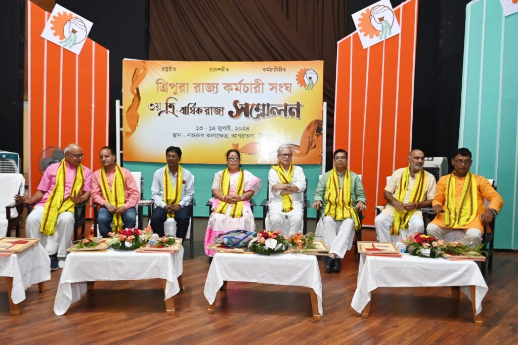 Agartala, 13th of July, 2024 : With the initiative of Tripura Rajya Karmachari Sangha organized 3rd Biennial Conference at Nazrul Kalakshetra, Agartala on Saturday (13th July, 2024). In the presence of many dignitaries Former Deputy Chief Minister Jishnu Dev Varma has inaugurated the Conference by lighting the lamp. Hon’ble Youth Affairs & Sports, Social Welfare & Social Education, Labour Minister Tinku Roy, Vipan Kumar Dogra, All India President, Rastriya Rajya Karmachari Mahasangh (RRKMS), Mahendra Pratap Singh, National Vice President, Bharatiya Mazdur Sangh(BMS) & Prabhari GENC, Vishnu Prasad Verma, All India central secretary, Rastriya Rajya Karmachari Mahasangh (RRKMS), Sankar Deb, (All India Vice President, Rastriya Rajya Karmachari Mahasangh (RRKMS), Smt. Debashree Kalai, State President, Bharatiya Mazdur Sanjg Tripura Pradesh, Sutapa Kar, National Secretary, Rastriya Rajya Kamarachari Mahasangh (RRKMs), Members of Tripura Rajya Karmachari Sangha were present in the Conference.