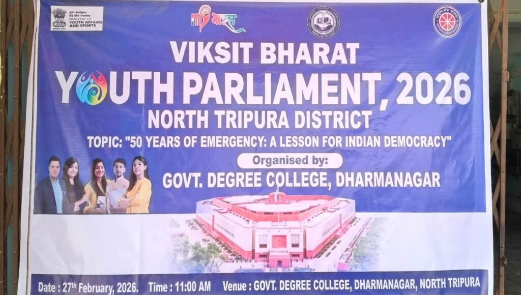 Dharmanagar, Tripura, 27th of February, 2026 : A solemn and meaningful district-level ‘Viksit Bharat Yuva Sansad 2026’ was held on Friday in Dharmanagar, North Tripura district. The programme was organized by Dharmanagar Government Degree College under the aegis of the Ministry of Youth Affairs and Sports, with participation from students of various educational institutions across the district.The event commenced at 11:00 AM on the college campus with the ceremonial lighting of the lamp. Guests were warmly welcomed with floral bouquets and traditional scarves. This year’s theme was “50 Years of the Emergency: Lessons for Indian Democracy.