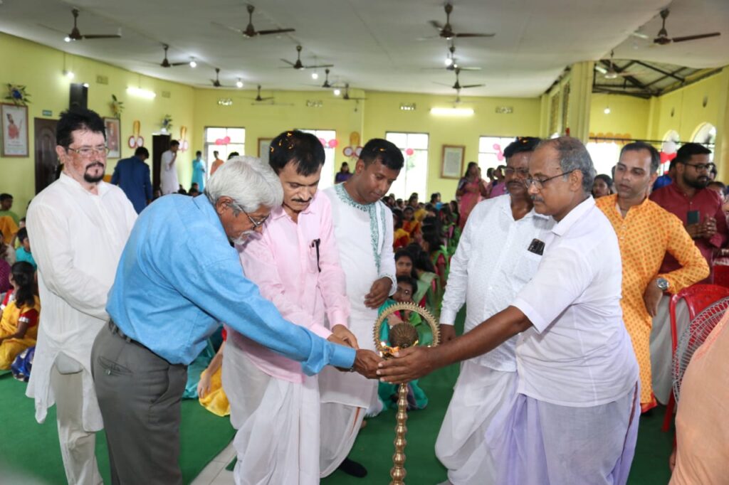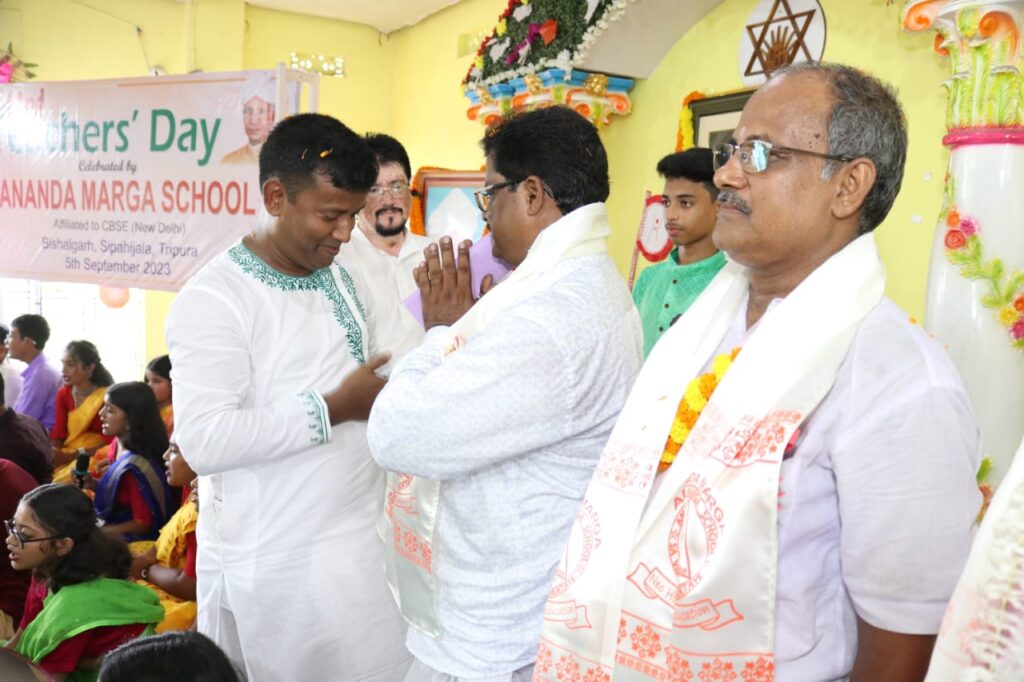 With the initiative of Ananda Marga School  celebrated Teachers’ Day at Ananda Marga School premises, Bishalgarh on Tuesday (5th September, 2023). On this auspicious occasion a large number of school students, teachers, dignitaries have assembled in the programme venue and observed the 62nd birth anniversary of Dr. Sarvepalli Radhakrishnan with due respect and dignity. Deb Prasad Bhattacharjee, Parimal Chandra Roy and Sushanta Chowdhury three prominent teacher of Bishalgarh inaugurated the programme by lighting the lamp at eleven in the morning. These three teachers were honored with the Ishwar Chandra Vidyasagar Memorial Award on behalf of Ananda Marga School. The school students have presented their different kinds of traditional cultural programmes in the occasion. The teachers of the school were honored with various honors dedicated of the Ananda Marga Pracharak Sangha.
