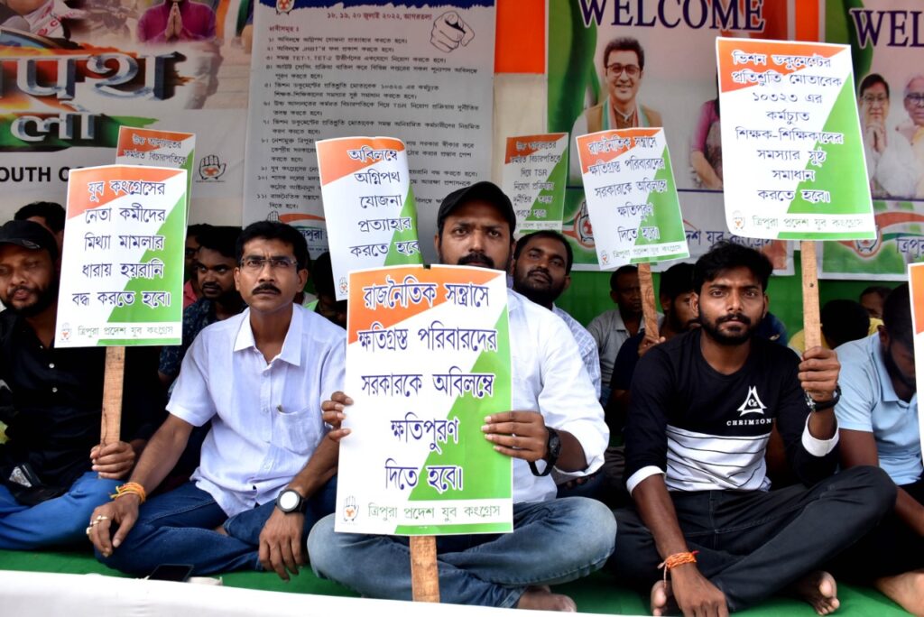 Tripura Pradesh Youth Congress on Monday (18th July, 2022) started stage protest for 72 hours at infront of Agartala City Centre on eleventh points demands.