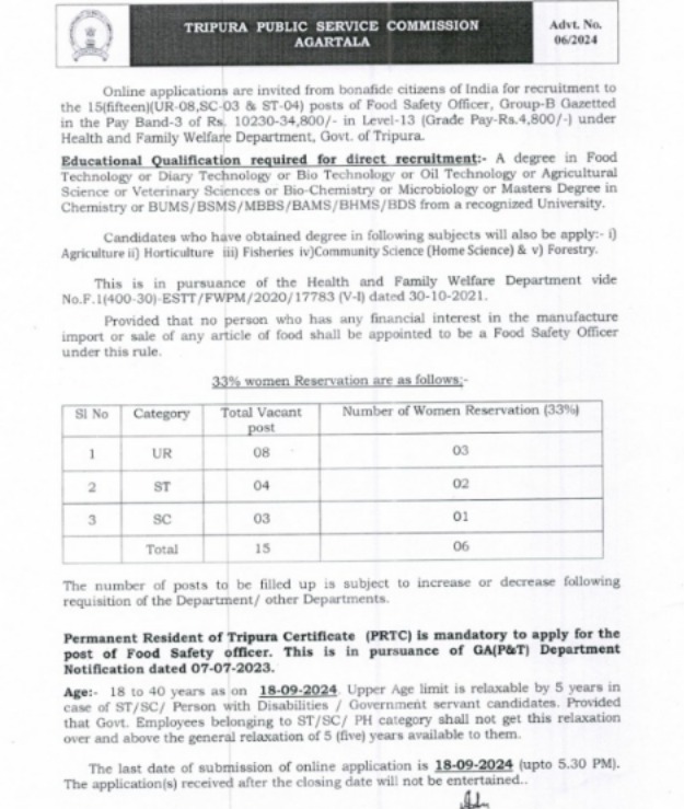 Agartala, Tripura, 8th of August, 2024 : Online applications are invited from bonafide citizens of India for recruitment to the 15(fifteen) (UR-08,SC-03 & ST-04) posts of Food Safety Officer, Group-B Gazetted in the Pay Band-3 of Rs. 10230-34,800/- in Level-13 (Grade Pay-Rs.4,800/-) under Health and Family Welfare Department, Govt. of Tripura.