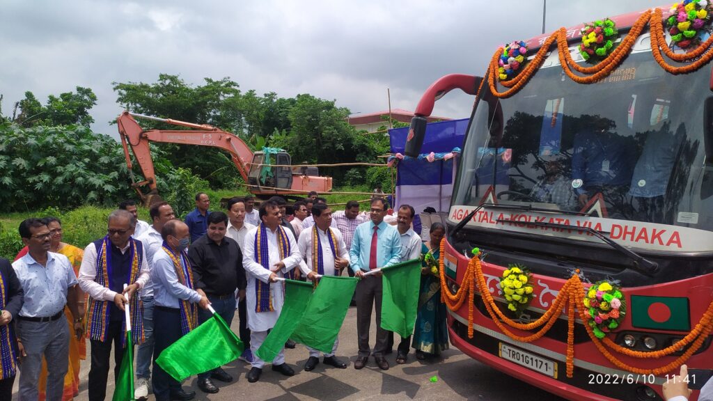 Hon’ble Agriculture, Transport & Tourism Minister Pranajit Singha Roy flagged off the bus that started for Kolkata from Akhaura Integrated Check Post (ICP) at Agartala on Friday (10th June, 2022). Hon’ble Mayor of Agartala Municipal Corporation (AMC) and TRTC Chairman Dipak Majumder, Hon’ble Assistant High Commissioner of Bangladesh Arif Mohammad and other dignitaries were present at the ceremony.