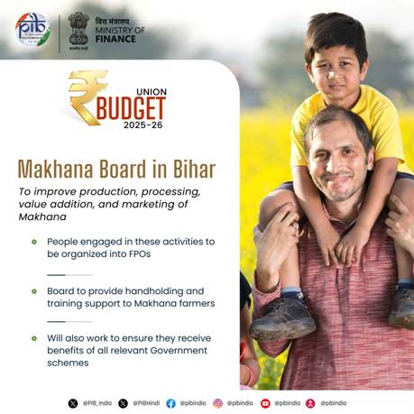 Announcing the Government’s decision to establish a Makhana Board in Bihar, Smt. Sitharaman said it will improve production, processing, value addition, and marketing of makhana as well as support the people engaged in these activities to be organized into Farmer Producer Organizations (FPOs). She added that the Board will provide handholding and training support to makhana farmers and also work to ensure they receive the benefits of all relevant Government schemes.