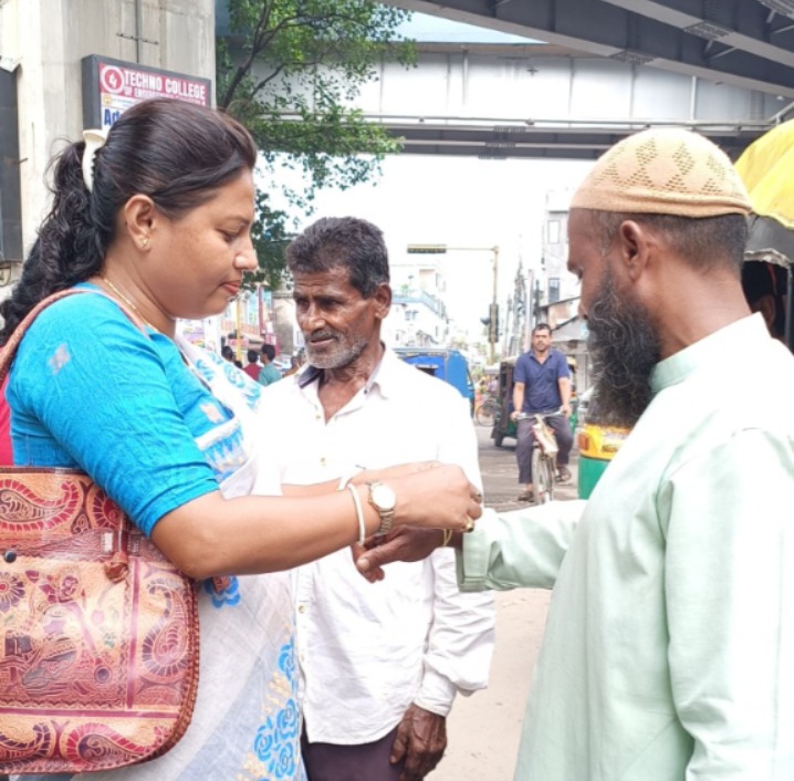 Agartala, Tripura, 9th of August 2025 : With the initiative of CPIM wing All India Democratic Women’s Association (AIDWA) Tripura State Committee Celebrated Rakhi Bandhan at Battala, Agartala, Tripura on Saturday (9th August, 2025). All India Democratic Women’s Association (AIDWA) Tripura State Committee activists tied Rakhi to Police Personnel, various businessmen, people on the way today.