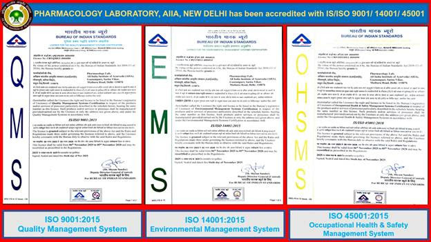 New Delhi, Delhi, 7th of November, 2025 : The Pharmacology Laboratory of the All India Institute of Ayurveda (AIIA), New Delhi — an autonomous organization under the Ministry of Ayush, Government of India has been accredited with the prestigious IS/ISO 9001:2015 (Quality Management System), IS/ISO 14001:2015 (Environmental Management System), and IS/ISO 45001:2018 (Occupational Health and Safety Management System) certifications by Bureau of Indian Standards. This was awarded during the event on Quality Management System certification organized by BIS for the officials of CCRH, New Delhi.