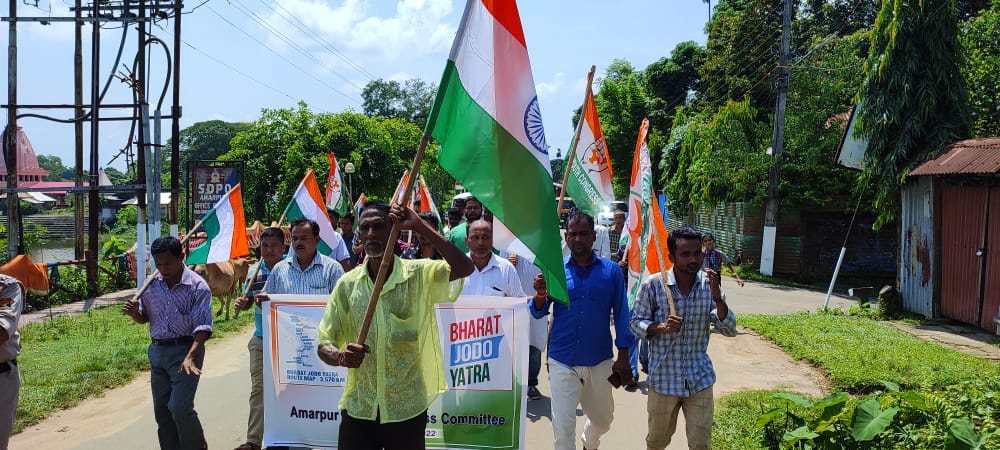 With the initiative of Amarpur block Congress committee Bharat Jodo Yatra rally has been organized here in Amarpur in Gomati district today (8th September, 2022). The Congress organization members of Amarpur block committee have taken participation in this rally and marched on roads by raising voice against the BJP administration. Under the supervision of the Amarpur block Congress committee president Pintu Saha this Bharat Jodo Yatra rally has been organized and given the message of awareness to public that the BJP administration is making the common people fool and cheating the countrymen. The Congress leaders have accused the BJP administration that they had given words to the countrymen in their vision documents that the MGNREGA wage would be 340 rupees, old pension would provide 2000 rupees and 50 thousands jobs would be provided in a year but they have implemented nothing. All are blasphemy and hypocrisy. The BJP party is based on religion discrimination and creating unsteady between Hindu and Muslim which is not acceptable. The National Congress is opposing this communal ideology and will form bigger step if the given vision documents are not fulfilled before the assembly election 2023.