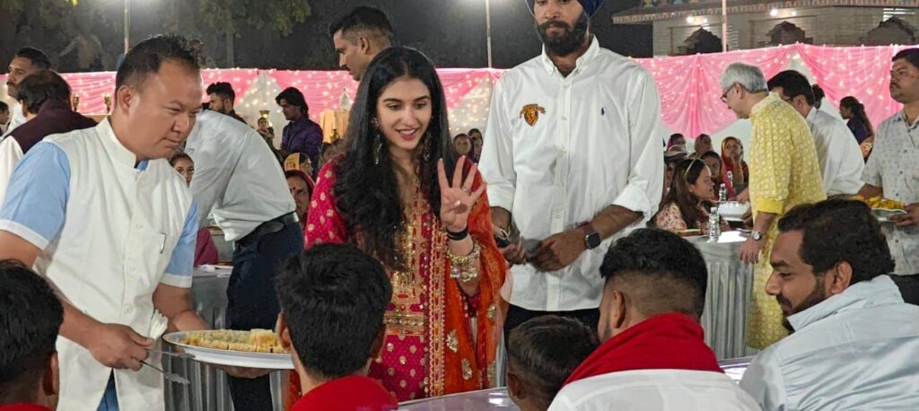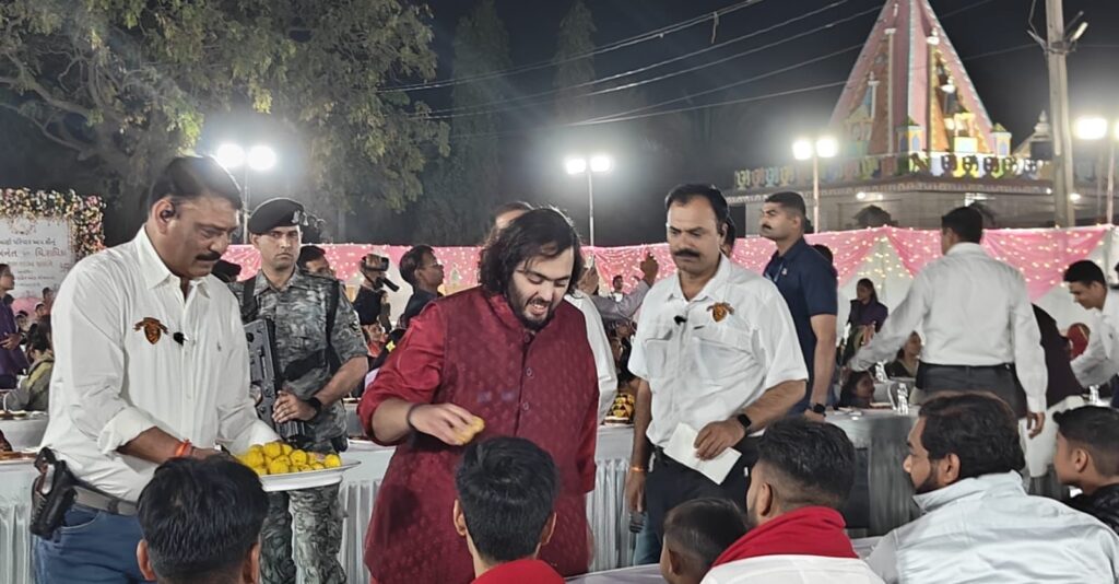 Today, at Jogvad village near the Reliance township in Jamnagar, members of the Ambani family, including Sh Mukesh Ambani, Sh Anant Ambani, Sushri Radhika Merchant, Sh Viren Merchant, Smt Shaila Merchant, and Radhika’s grandmother, personally served traditional Gujarati dinner items to the community from nearby villages and sought their blessings.
