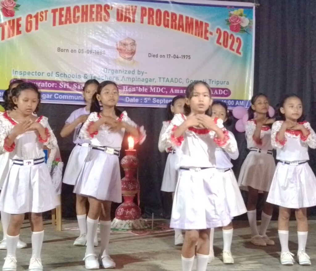 Addressing the participants the retired HM Surjya Das has said, “Teachers are the most precious for the society and they have a significant contribution over all kinds of social progress and achievements. The great idealism of the greatest teachers Dr. Sarvepalli Radhakrishnan has inspired our country very much. The ideal personality of a person appears through his genuine learning from a genuine path finder.” Amidst the other distinguished participants there were Tapan Debbarma, (ADC A.I.S of Ampinagar) Shibshadan Jamatia, ADC A.I.S, Surjya Bashi Molsom, district zonal chairman, Deb Sadhan Jamatia, Ampi sub-zonal chairman, Subhash Debbarma, Ampi block TIPRA Motha president, Sanjay Jamatia, social activist and many others remained present in the programme. The ADC school children have presented attractive indigenous cultural programmes to beautify the teachers day celebration. Several cultural programme provider teams from different ADC schools and hostels have taken active part in this auspicious occasion.