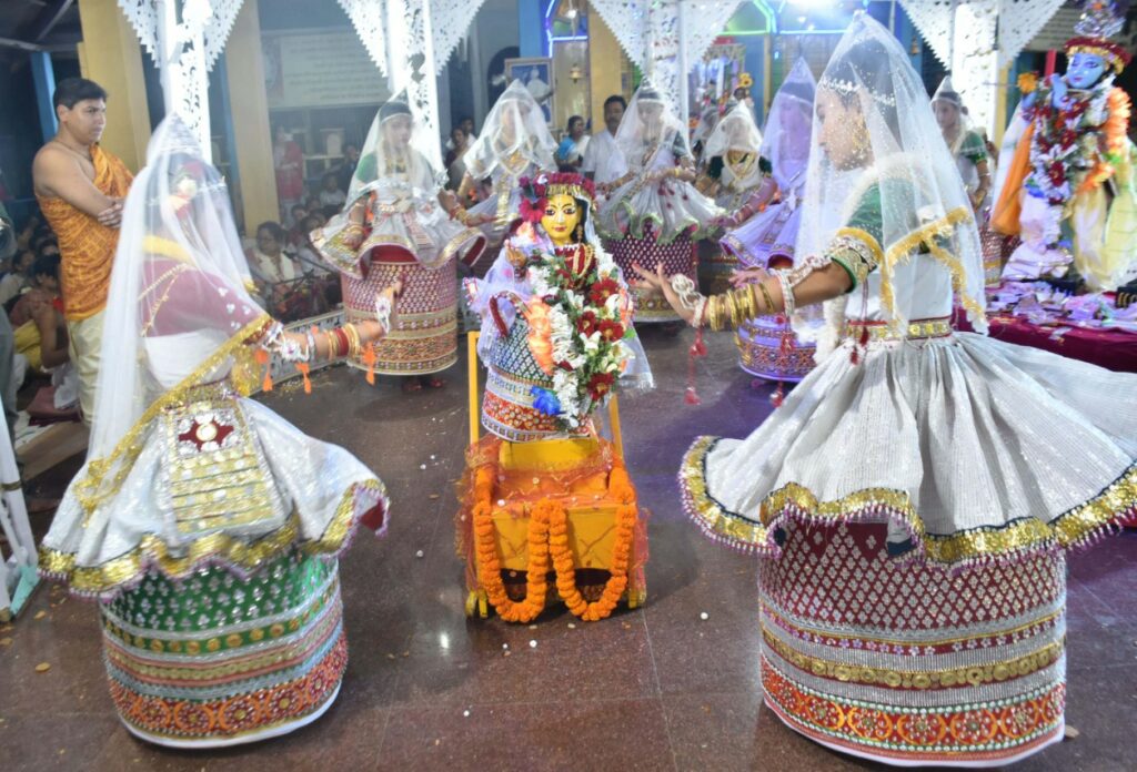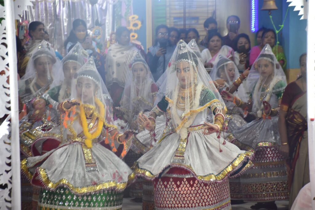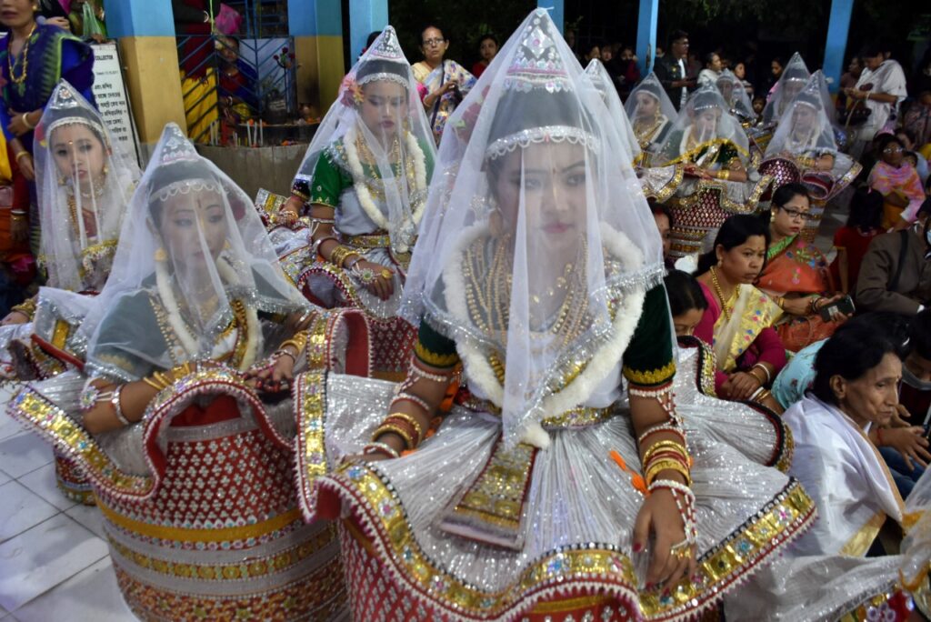 An artist wearing a traditional Manipuri dress dance a candle as she performs during the Maha Raas in Agartala, November 18, 2021