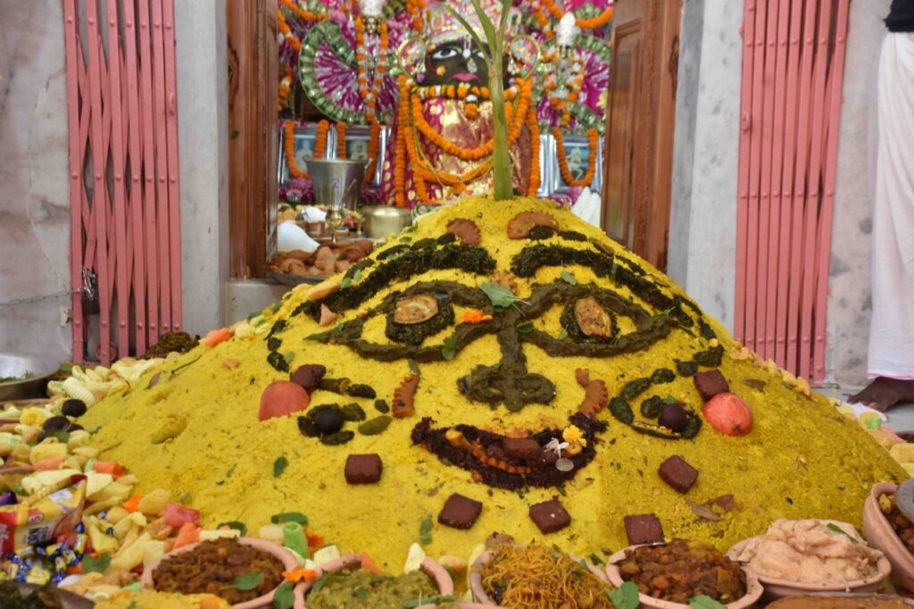 Annakut or Annakoot was celebrated with full devotion in the Jagannath temple in Agartala on today (5th November, 2021). Annakut is a day of having collective food. On this occasion, devotees prepare large and lavish meals, which are symbolic of Govardhan Hill, and are offered to Lord Krishna, who saved the villagers of Vrindavan from the wrath of Lord Indra.