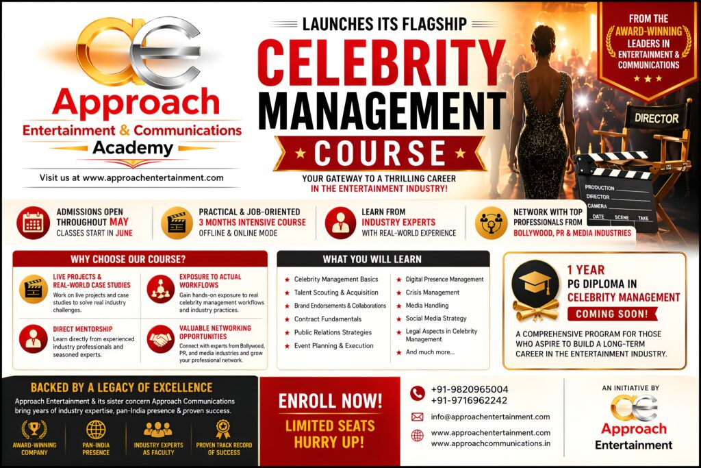Mumbai, Maharashtra, 23rd of April 2026 : Approach Entertainment & Communications Academy has announced the launch of its flagship Celebrity Management Course, a specially designed program aimed at preparing aspiring talent for one of the most dynamic and fast-growing career paths in the entertainment & media industry.
