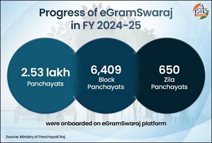 AI-enabled governance is further strengthened through digital platforms such as eGramSwaraj and Gram Manchitra. Developed under the e-Panchayat Mission Mode Project and launched in April 2020, eGramSwaraj consolidates key Panchayat functions-including planning, budgeting, accounting, monitoring, asset management, and payments-into a unified digital system. In FY 2024-25, the platform onboarded over 2.53 lakh gram panchayats, along with 6,409 block panchayats and 650 Zila panchayats, reflecting its extensive adoption in decentralised governance.