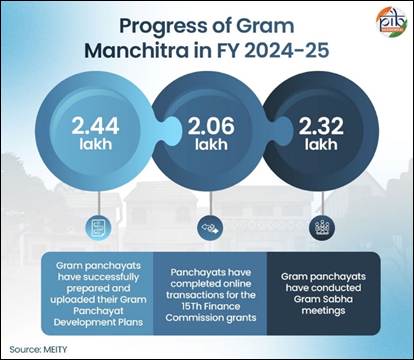 Gram Manchitra complements administrative systems by offering GIS-based visualisation and planning tools tosupport rural development. It enables Panchayats to map assets, monitor projects, and integrate spatial data into Gram Panchayat Development Plans (GPDPs). By linking geotagged infrastructure with demographic and environmental data, the platform enables evidence-based decision-making across infrastructure planning, natural resource management, and disaster response, thereby strengthening alignment between planning and implementation. As of FY 2024–25, 2.44 lakh gram panchayats have prepared and uploaded GPDPs, 2.06 lakh have completed online transactions under the 15th Finance Commission grants, and 2.32 lakh have conducted Gram Sabha meetings.