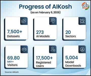 AIKosh serves as a national repository of AI datasets and models to advance public-sector innovation. It consolidates data from governmental and non-governmental sources and offers ready-to-deploy AI models across diverse sectors. With more than 7,500 datasets and 273 AI models spanning 20 industries, the platform lowers entry barriers for developers designing governance and service delivery applications. By enabling the reuse of foundational AI components, AIKosh accelerates the development of solutions for rural e-governance and public administration. As of 9 February 2026, the platform has recorded over 69.80 lakh visits, 17,500 registered users, and 5,004 model downloads, underscoring the expanding role of shared data infrastructure in scaling AI for public good.
