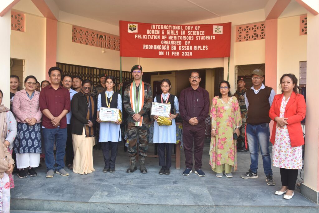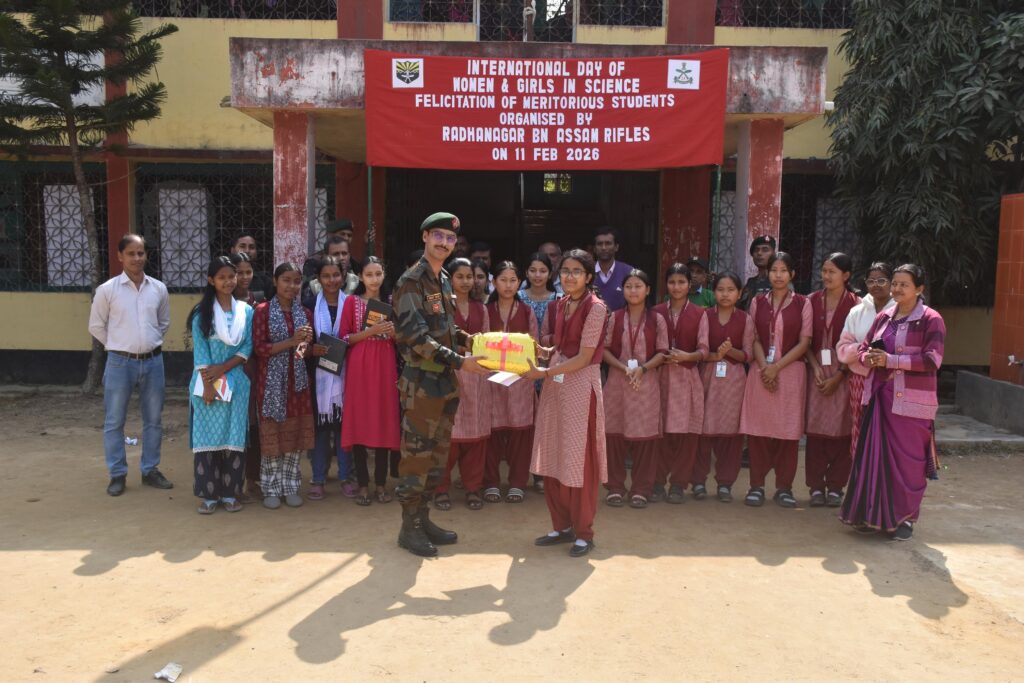 Agartala, Tripura, 14th of February, 2026 : On the occasion of International Day of Women in Science, Assam Rifles  organised a felicitation ceremony at multiple schools to recognise and encourage girl students excelling in science subjects. The events were conducted at five schools, to include Fatikroy Govt Higher Secondary School, Kumarghat Girl’s Higher Secondary School, Holy Cross School, Fatikroy Girl’s High School and Ambedkar College, where meritorious girl students were honoured for their academic performance in science.