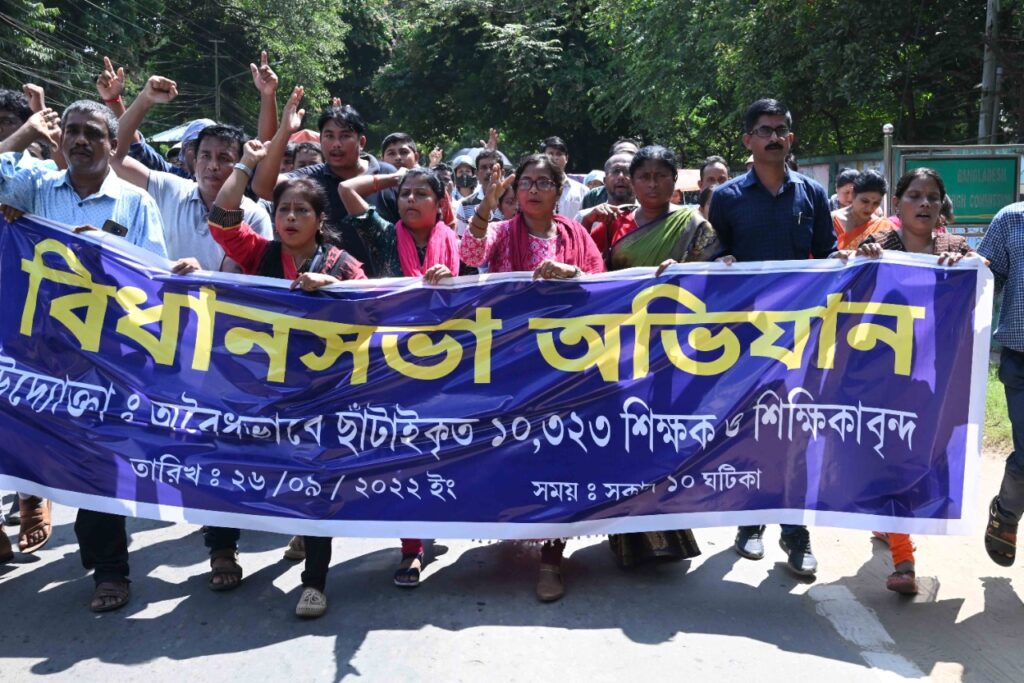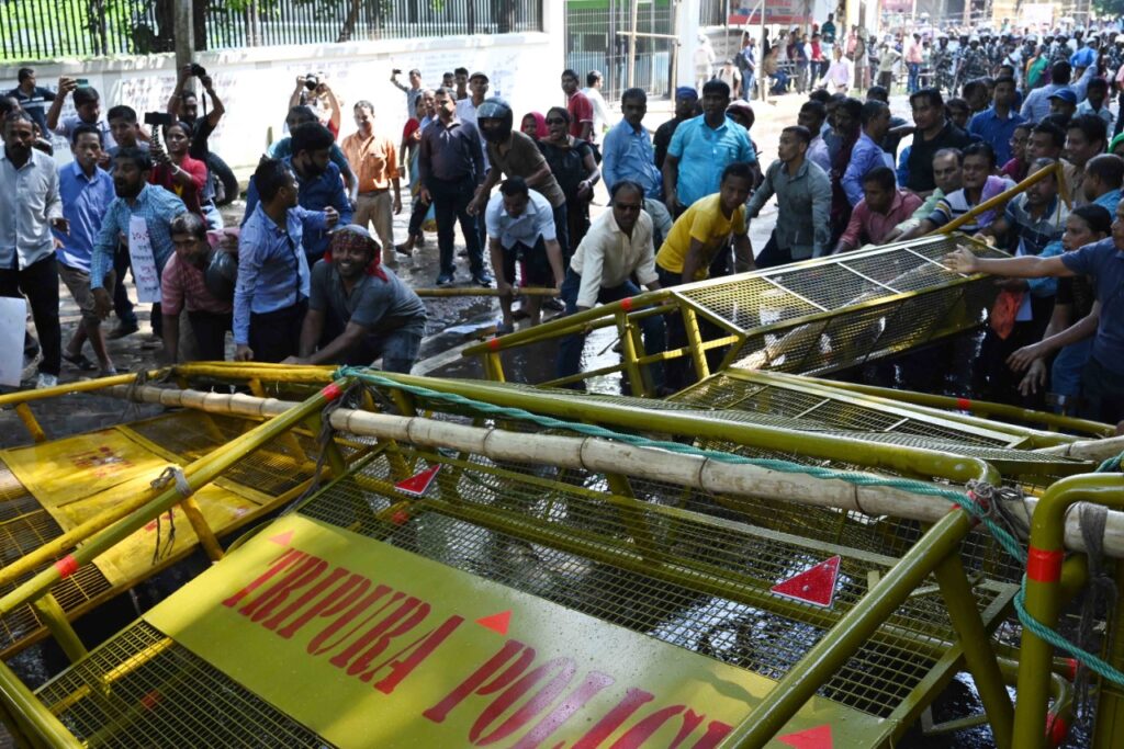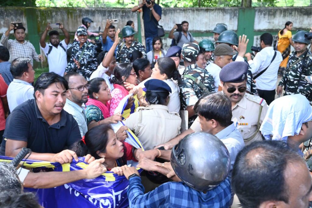 The terminated 10,323 teachers’ organization has organized an Assembly Abhiyan on Monday (26th September, 2022). Police and security personnel barricaded in front of the Circuit House to intercept them. The teachers tried to break through the barricades leading to clashes with police personnel and TSR jawans. On the way to break the barricade, police personnel and TSR jawans water cannons were used.