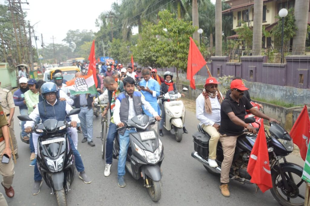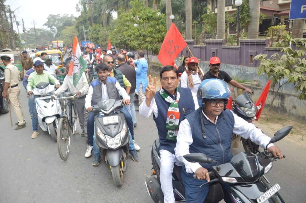 Aiming to upcoming Assembly election 2023 Congress and CPI(M) jointly organized a bike rally at Banamalipur-9 Assembly Constituency on Thursday (9th February, 2023) supported Congress candidate Gopal Chandra Roy from Banamalipur-9 Assembly Constituency. Tripura Pradesh NSUI President Samrat Roy and many others remained present in the rally.