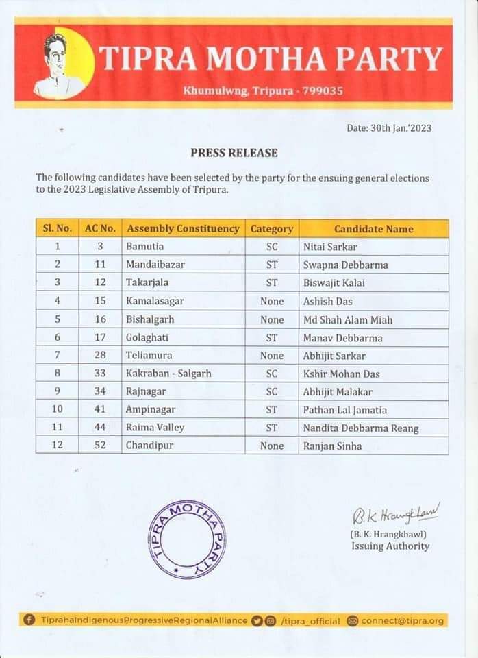 Tipraha Indigenous Progressive Regional Alliance (TIPRA) Motha declared 3rd Phase candidates list for the Assembly Election 2023 on Monday (30th January, 2023). TIPRA announced 3rd Phase 12 candidates for the forthcoming General Election to Tripura Legislative Assembly-2023.