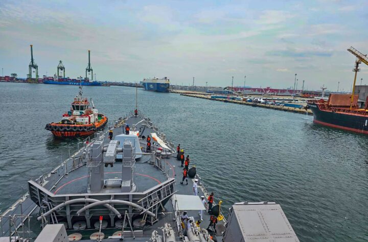New Delhi, Delhi, 18th of January, 2025 : The indigenously designed and built guided missile destroyer INS Mumbai is participating...