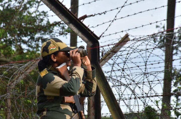 Indian Border Security Force (BSF)150 Battalion personnel patrol along India- Bangladesh border ahead of Independence Day celebrations at Boxanagar.