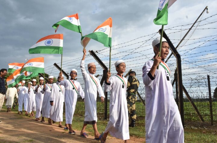 Muslim children's participate in a Tiranga Yatra organized by BSF frontier 150 BN as part of Azadi Ka Amrit Mahotsav...