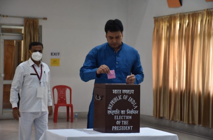 Former Chief Minister Biplab Kumar Deb casts his vote for the presidential election at the lobby of the Legislative Assembly,...