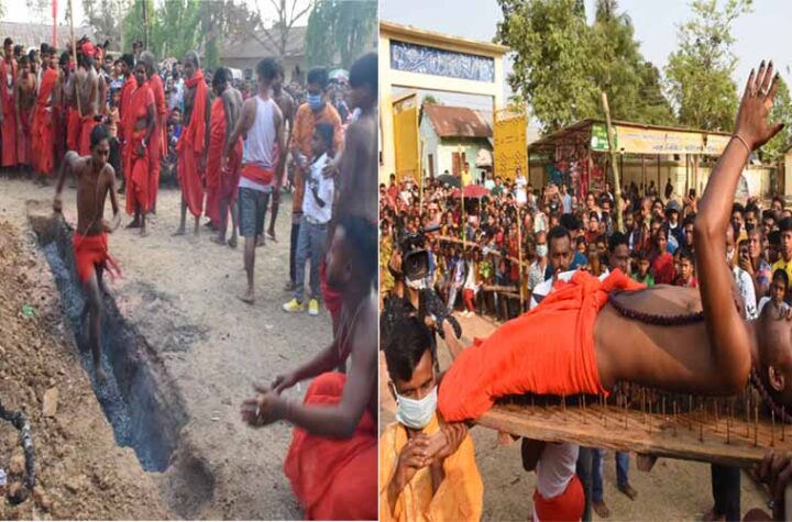 The man is walking over the fire and another one devotee lies on a bed of nails as he is...