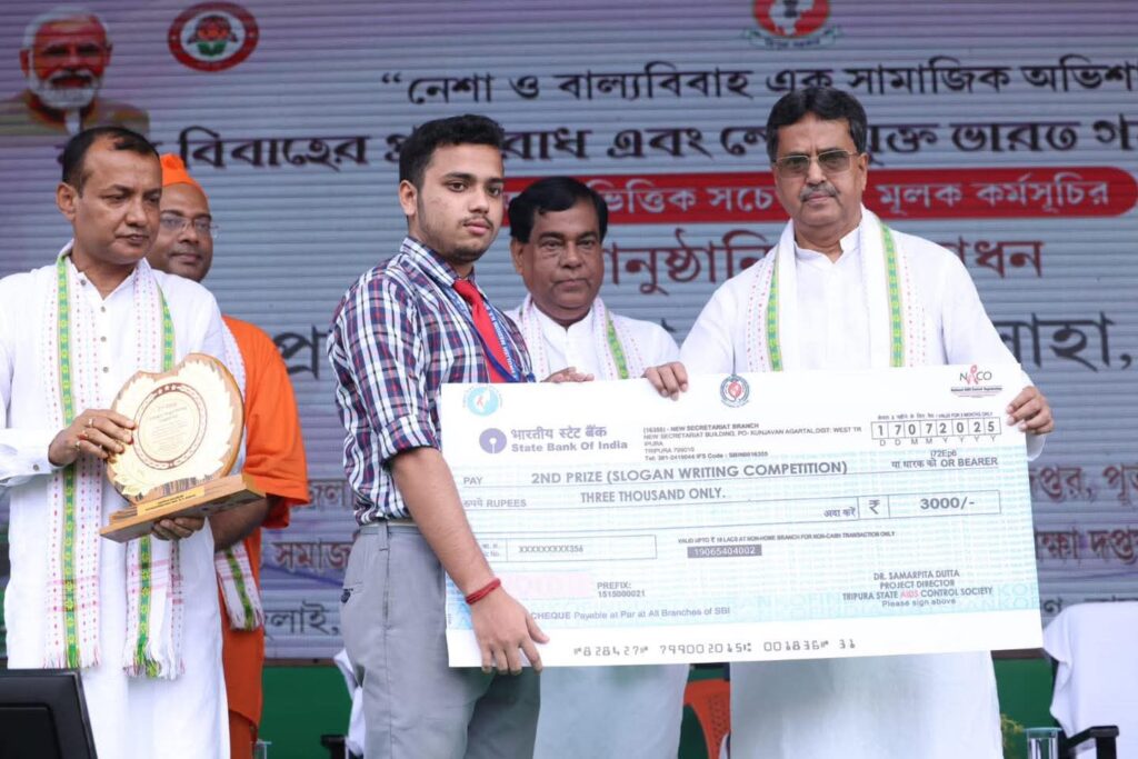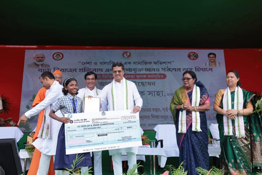 Addressing at the awareness campaign on Neshamukta Bharat Abhiyan and Child Marriage Hon’ble Chief Minister Dr. Manik Saha said that People from all sections of society must come forward against social ills like drug addiction and child marriage. The State Government is working to raise awareness among the common people to prevent such social problems and to build a healthy and beautiful society. At the event, the Chief Minister and other guests presented awards and certificates to the 6 students who stood first, second and third in the slogan writing and drawing competition on prevention of illegal drugs and child marriage. In addition, the guests presented awards and certificates to the 6 students who achieved the best results in the West District in the T.B.S.E. and CBSE board examinations and loan cheques of Rs. 12 lakh to 4 self-help groups in the district.