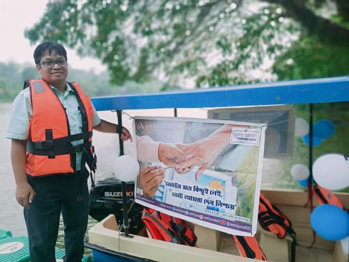 Khowai, 23rd of April, 2024 : With the initiative of Khowai District Election Officer ‘Electoral Awareness based Boat Drive’ As part of the Systematic Voters’ Education and Electoral Participation (SVEEP) drive, at Chakmaghat Barrage Reservoir under Khowai District on Tuesday (23rd April, 2024). Aimed of the Boating Program was to promote the message “No Voter To Be Left Behind”. The event, attended by both local residents and visitors, emphasized the importance of inclusive voter engagement.