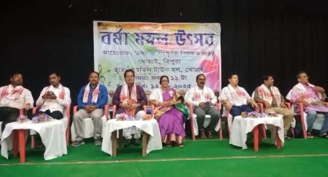 Khowai, Tripura, 12th of August, 2025 : With the initiative of Information and Cultural Affairs Department Khowai District organized Barsha Mangal Festival at Old Town Hall, Khowai on Tuesday (12th August, 2025). In the presence of many distinguished dignitaries Khowai Zilla Saha-Sabhadipati Aparna Singh Roy (Datta) inaugurated the event. Addressing at the celebration ceremony of Barsha Mangal festival Khowai Zilla Saha-Sabhadipati Aparna Singh Roy (Datta)in detail about the Barsha Mangal festival.