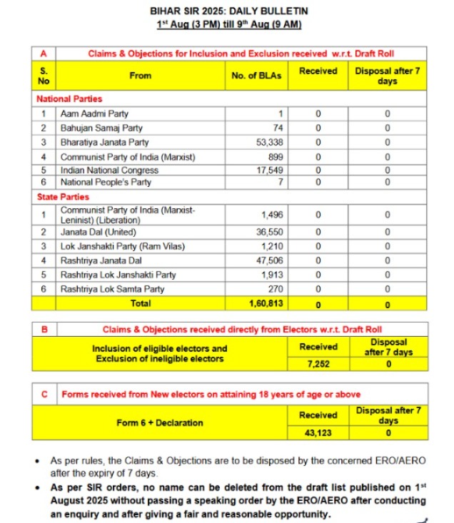 New Delhi, Delhi, 9th of August 2025 : Bihar Sir 2025: Daily Bulletin 1st Aug (3 PM) till 9th Aug (9 AM).