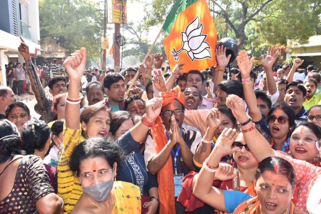 Bharatiya Janata Party (BJP) candidate Alak Bhattacharjee of ward no. 21 celebrates his victory at Agartala in Municipal Poll.