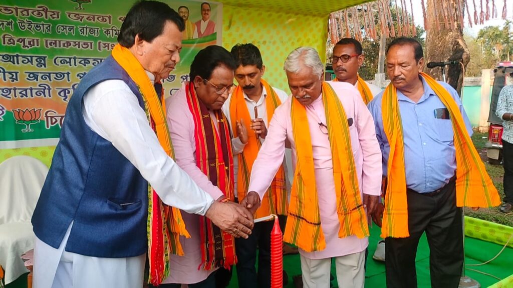 Khowai, 31st of March, 2024 : With the initiative of the Bharatiya Janata Party rally has been conducted in support of  Bharatiya Janata Party and Tipraha Indigenous Progressive Regional Alliance (TIPRA) Motha Party nominated candidate of Tripura East Parliamentary Constituency Kriti Singh Debbarma at Gournagar area, Khowai on Sunday (31st March, 2024). Tapas Bhattacharya, Vice President of Tripura Pradesh BJP, Joydeb Debbarma Sabhadhipati of Khowai Zilla Parisad, Tapas Kanti Das, Panchayat Samiti Vice Chairman, Social activist Shyamal Deb, Milan Dutta and other leaders were present in the rally.