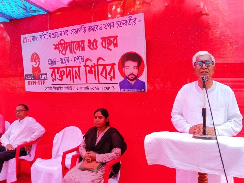 Khowai, Tripura, 3rd of August, 2025 : With the jointly initiative of CPM wing DYFI and TYF Khowai district Committee organized Blood Donation Camp on the occasion of of the 25th death anniversary of former DYFI State Committee President Comrade Tapan Chakraborty at the Khowai CPM district office on Sunday (3rd August, 2025) at 12 noon.