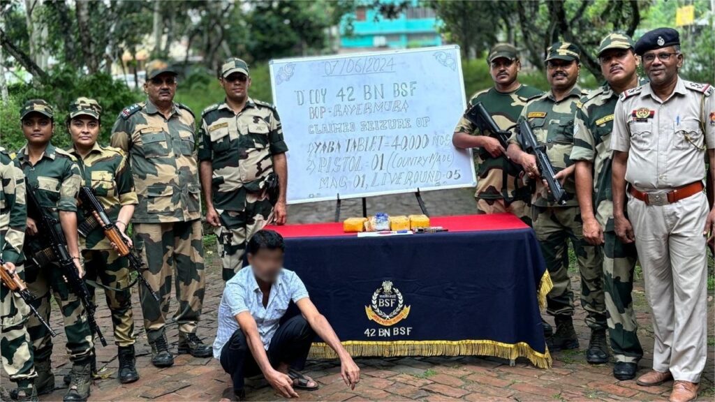 Agartala, 7th of June, 2024 : In a significant joint operation,on 7th June 2024 , Border Security Force (BSF) and Tripura Police seized a huge quantity of yaba tablets and one pistol along with Magazine & ammunition from a house in the village of Motinagar located close to International Border in the area of BOP Rayermura, 42 Bn BSF, under the jurisdiction of PS Amtali, West Tripura District.