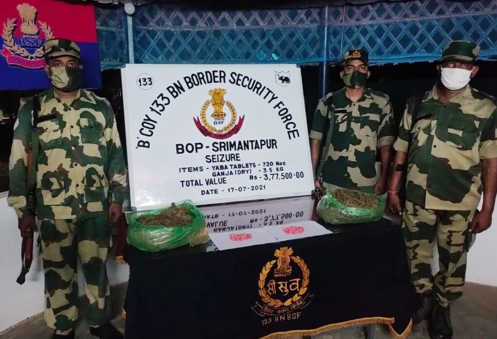 BSF Tripura while neutralizing the ill designs of Trans-border Narcotics / Drug smugglers is regularly conducting ‘Special Anti-Narcotics Drives’ in the State.On intervening night of 17/18 July 2021, BSF troops foiled smuggling bids & seized “1,112 Nos Yaba Tablets, 37.5 Kgs Ganja, 0.26 Gms Brown Sugar along with 07 Nos Cattle and other contraband items having total value Rs. 10,00,567/- and apprehended 02 drug peddlers. In a separate operation, the troops also neutralized exfiltration attempt by apprehending 02 Bangladeshi Nationals”.