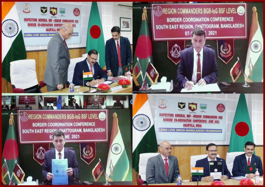 Inspectors General BSF – Region Commanders BGB level Border Co-ordination Conference conducted from 07th – 11th June 2021through Video Tele Conferencing (VTC) concluded today (Forenoon)with signing of Joint Record of Discussion (JRD) document. This is the first time when this prestigious Biannual Conference was held through tele conferencing, in the wake of COVID pandemic situation.