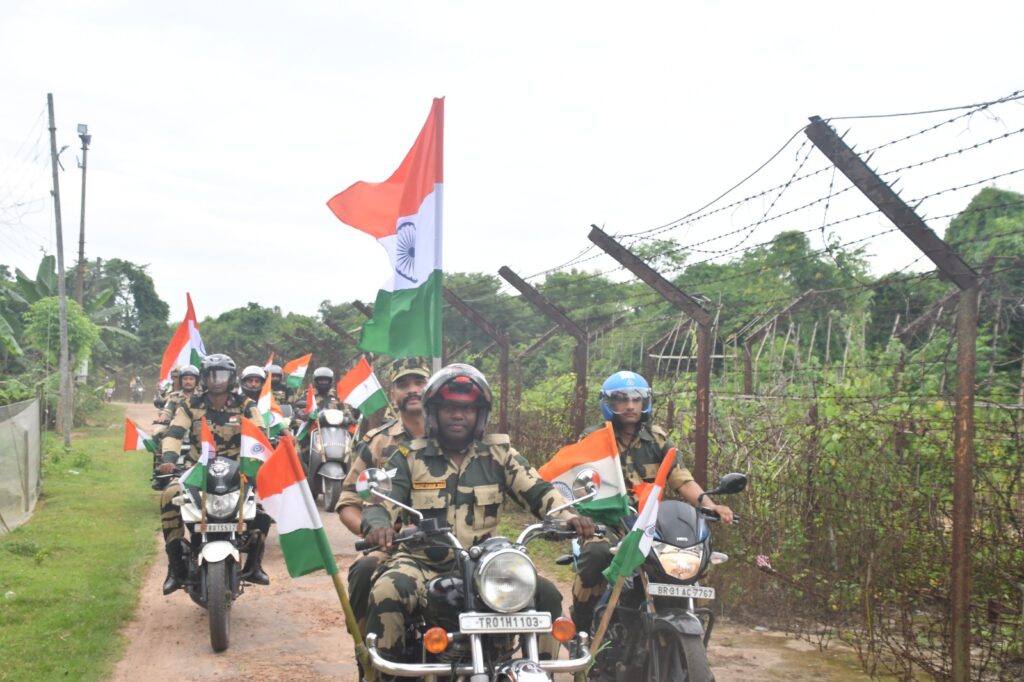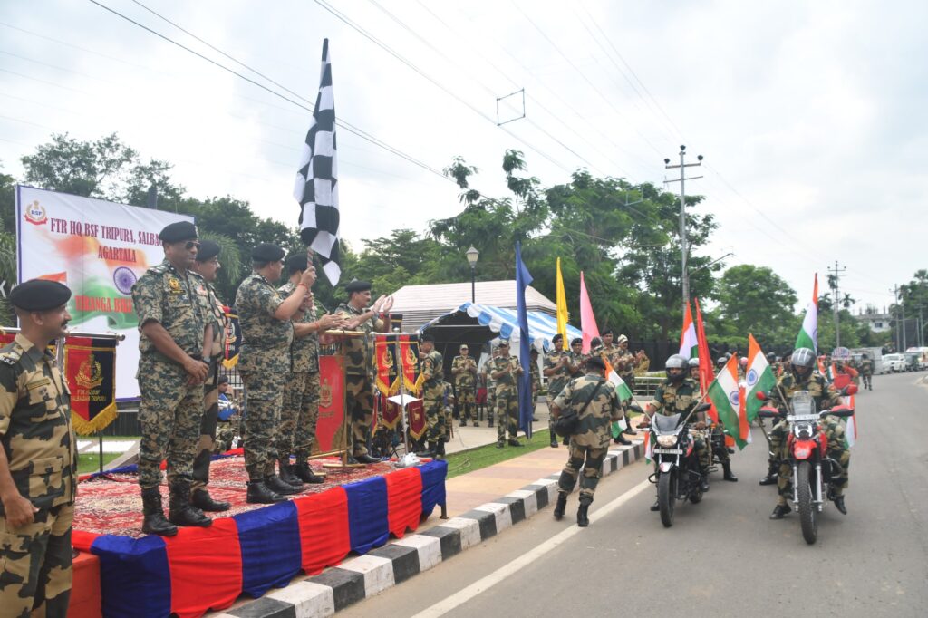 Agartala, Tripura, 12th of August, 2025 : In a spirited display of patriotism and unity, On 12th Aug 2025, the Border Security Force (BSF), Frontier Headquarters Tripura, organised a Motorcycle Rally under the nationwide “Har Ghar Tiranga” campaign.  The rally was flagged off by Shri Ashwani Kumar Sharma, Inspector General, Frontier HQ BSF Tripura.