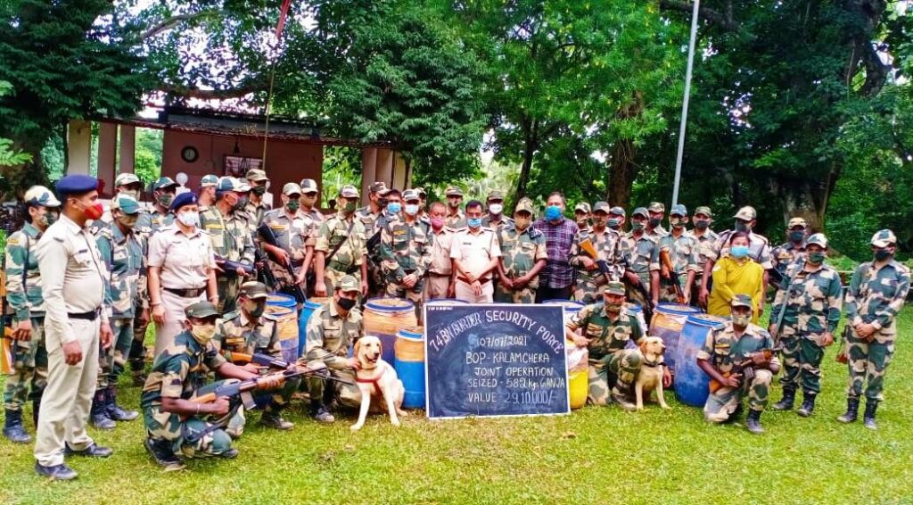 On 07th July 2021, based on a specific Intelligence input, BSF troops of 74 Bn BSF conducted a joint operation along with officials of DRI Agartala and State Police officials of PS-Kalamchera in general area of Village- Dakshin Kalamchera, PS- Kalamchera, Sub Division- Sonamura, District- Sepahijala, Tripura. During the operation, party recovered huge consignment of “Dry Ganja weighing 582 Kgs worth Rs. 29,10,000/-”, which was clandestinely hidden at two different places in the Village- Dakshin Kalamchera and also apprehended one civilian namely Manik Debnath (approx. 38 Yrs) S/o Sadhan Debnath R/o Village- Dakshin Kalamchera suspected to be involved in the crime. The apprehended person along with seized Ganja was handed over to PS- Kalamchera on the spot for further legal action.