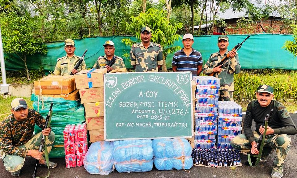 On 08th Dec 2021 acting on specific BSF intelligence input, vigilant BSF troops of BOP NC Nagar, Ex-133 Bn BSF, Gokulnagar seized “37 Kgs Ganja worth Rs. 1,85,000/-&100 Bottles of Eskuf Syrup worth Rs 14,900/- along with other contraband articles worth Rs 2,10,376/- having combined seizure value of Rs. 4,10,276/-”. The seized Ganja and Eskuf Syrup has been handed over to Police Station- Sonamura and other contraband items have been handed over to Customs Sonamura, Sub Division- Sonamura, District- Sepahijala (Tripura)for further disposal.