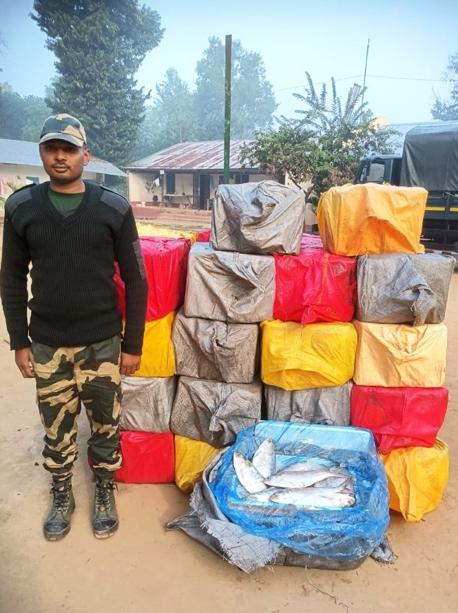 In the series of Special Operations to thwart the trans-border smuggling activities in State of Tripura, BSF is continuously succeeded in seizing huge quantity of narcotics and contraband items along the Indo-Bangladesh border as well as in the hinterland. In the intervening night of 16/17Nov 2020, BSF Tripura again succeeded in seizing 51.5 Kgs Ganja, 11 Bottles Liquor, 1,375 Kgs Hilsa (ilish) Fish and other contraband articles having combined value of Rs. 40,79,690/-,besides apprehended 01 Bangladeshi intruder during various operations.
