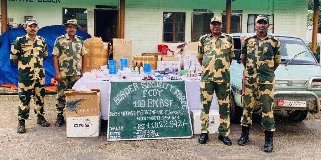 Agartala, Tripura, 28th of August, 2024 : On the night intervening 27th & 28th August 2024, on specific information BSF troops of BOP Srinagar under South Tripura District intercepted a vehicle in border area and recovered various types of medicines worth Rs 1.04 crore and foreign made cigarettes worth Rs 3 lakhs.