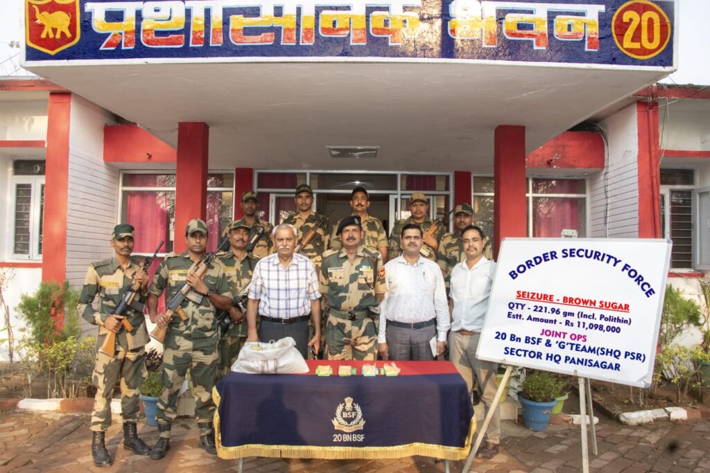 On the specific input, a Special Operation was launched by team of BSF on 28 March 2023 at 1350 hrs, at Railway Station Kumar Ghat, wherein a thorough search of coach number D-4 of train No. 15664 going from Silchar to Agartala was carried out. During the search, a seizure of appx 221.96 gms of suspected brown sugar was made from a white colour plastic bag left abandoned by the suspect who managed to slip away taking advantage of the crowd of passengers. The estimated value of seized brown sugar is approx Rs.1,10,98,000 Crore in the international market. BSF is persistently putting effort to make society drug-free by enforcing the rule of law and such seizure of drugs is a decisive step in that direction.