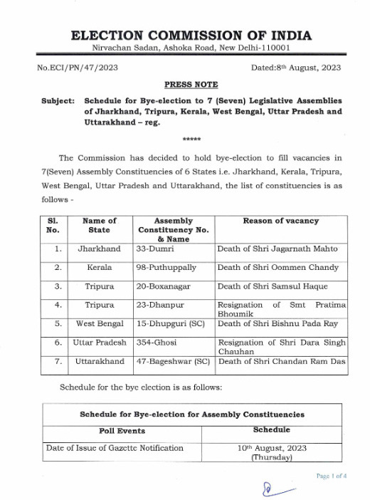 The election commission of India (ECI) on Tuesday (8th August, 2023) has announced the date of by-elections for Boxanagar and Dhanpur assembly constituencies on September 5.