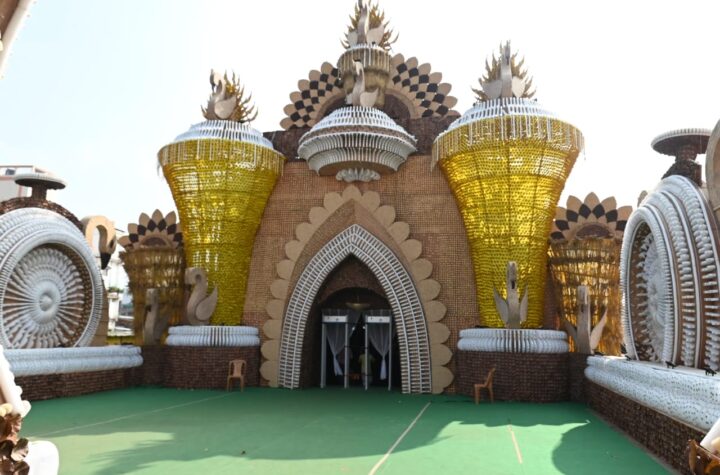 Agartala, Tripura, 12th of October 2024 : Flowers Club’s Goddess Durga Idol and Puja Pandal at Math Chowmuhani, Banamalipur, Agartala, Tripura.