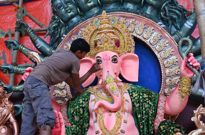 An artisan gives finishing touches to an idol of Deity Ganesh ahead of the upcoming Ganesh Chaturthi Festival at Agartala...