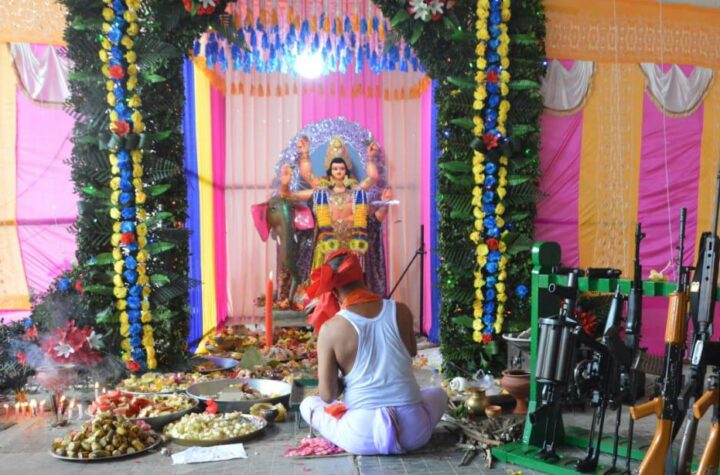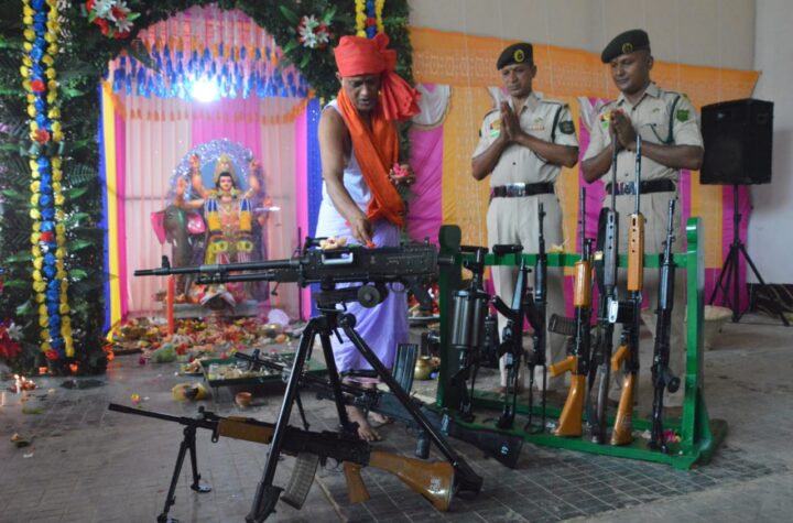A priest performs worship of weapons on the occasion of Vishwakarma Puja at Tripura State Rifles (TSR) 2nd Battalion at...