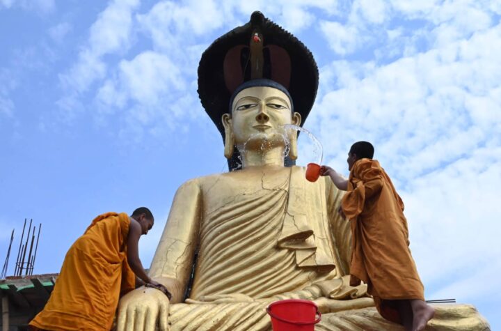 Buddhist devotees clean a statue of Lord Buddha on the eve of ‘Vesak’ in Agartala on Tuesday (2nd May, 2023)....